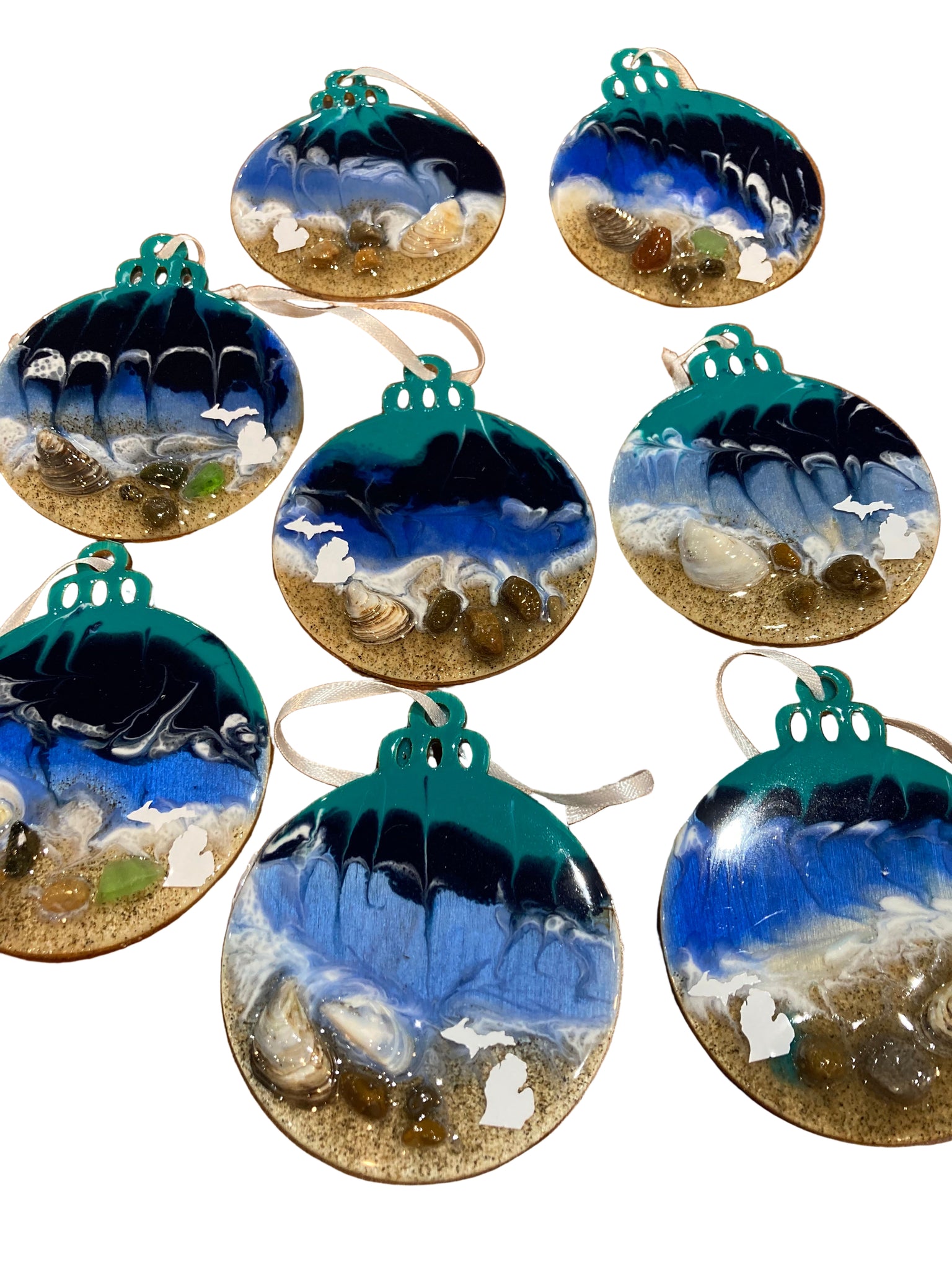 Experience the beauty of Lake Huron with our MI Beach Ornament. Made of high-quality resin, this 2 1/2 inch round ornament features authentic sand, shells, rocks, and beach glass from Michigan's stunning beaches. Add a touch of nature and charm to your holiday decorations.