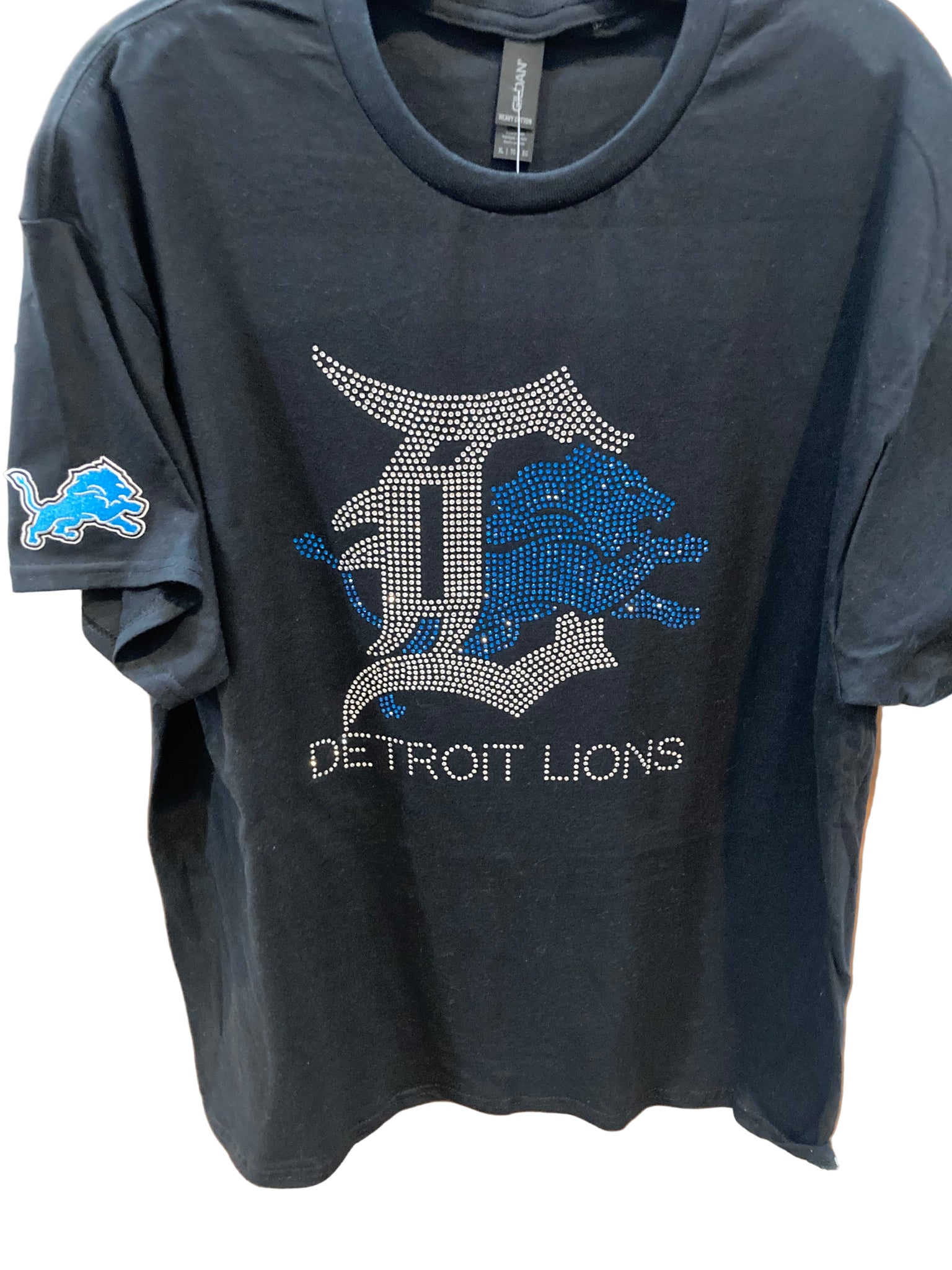 Experience the ultimate fan gear with our Detroit Lions Rhinestone Shirt! Made with heavy cotton, this T-shirt features a stunning 10“ x 10“ rhinestone logo on the front and an embroidered lion on the sleeve. Available in three colors and two styles, show your team spirit in style and comfort. Go Lions!